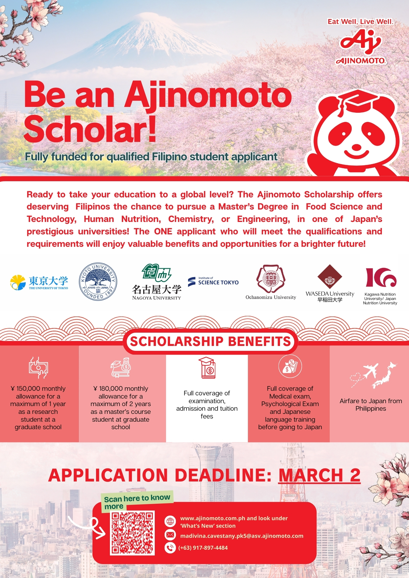 The successful applicant who will meet the program’s qualifications and requirements will receive comprehensive support and access to valuable benefits designed to help them thrive in their postgraduate journey. These include full coverage of examination, admission and tuition fees; full coverage of medical exam, psychological exam and Japanese language training before going to Japan; as well as a monthly allowances. The scholar’s airfare from the Philippines going to Japan will also be covered.