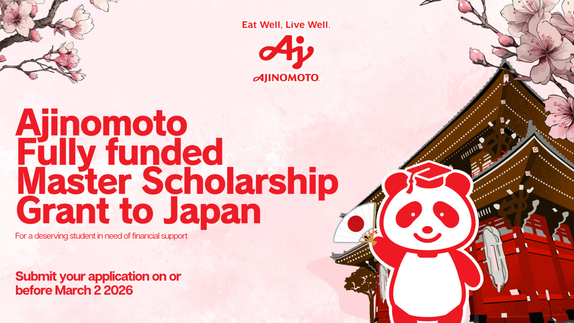 APC announces that applications are now open for the 2027 Ajinomoto Foundation Postgraduate Scholarship Grant, a program that provides deserving candidates the opportunity to take up master’s-level studies in Food Science and Technology, Human Nutrition, Chemistry, or Engineering at partner schools including: University of Tokyo, Kyoto University, Nagoya University, Institute of Science Tokyo, Ochanomizu University, Waseda University, and Japan Nutrition University (formerly Kagawa Nutrition University).