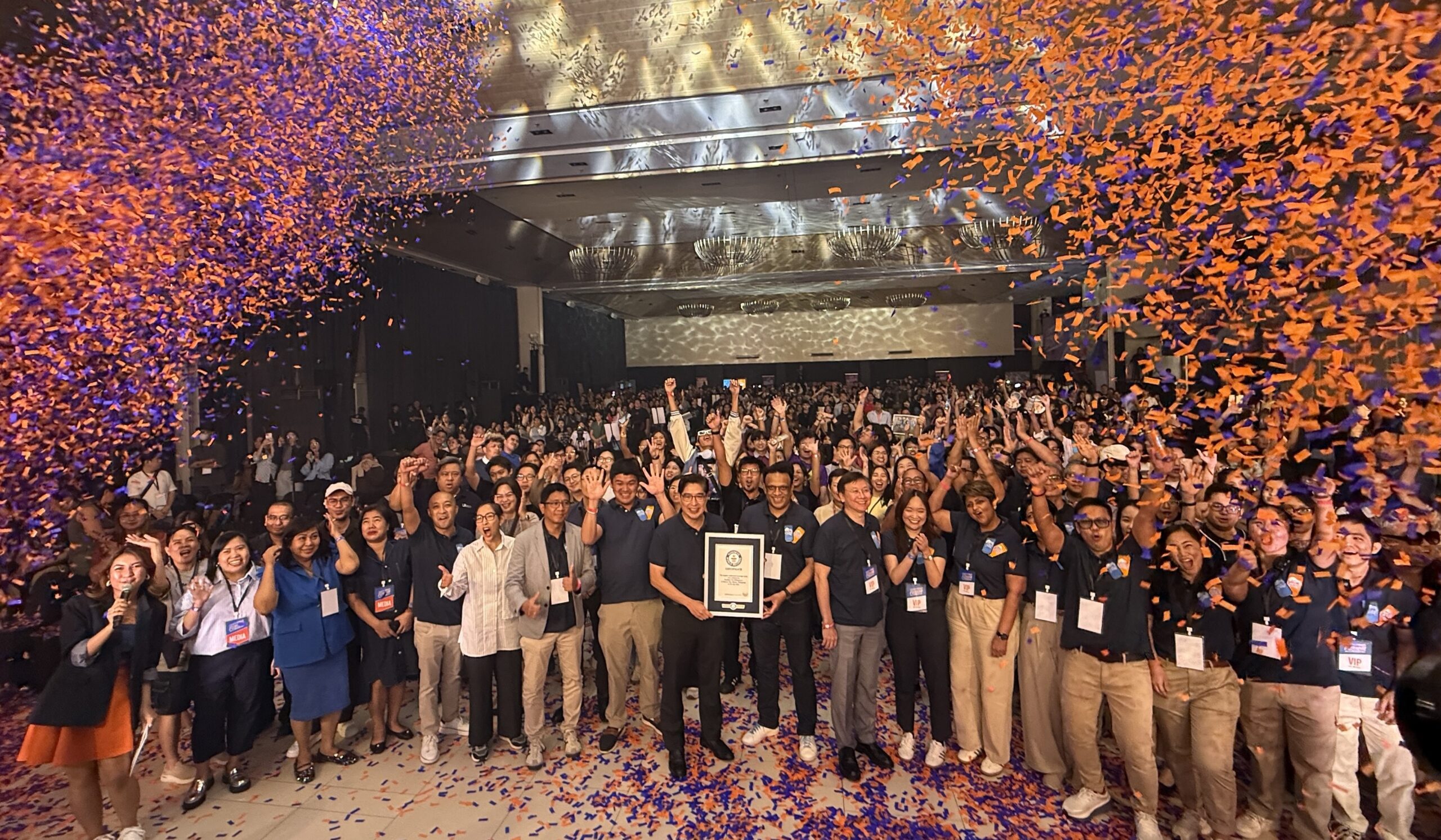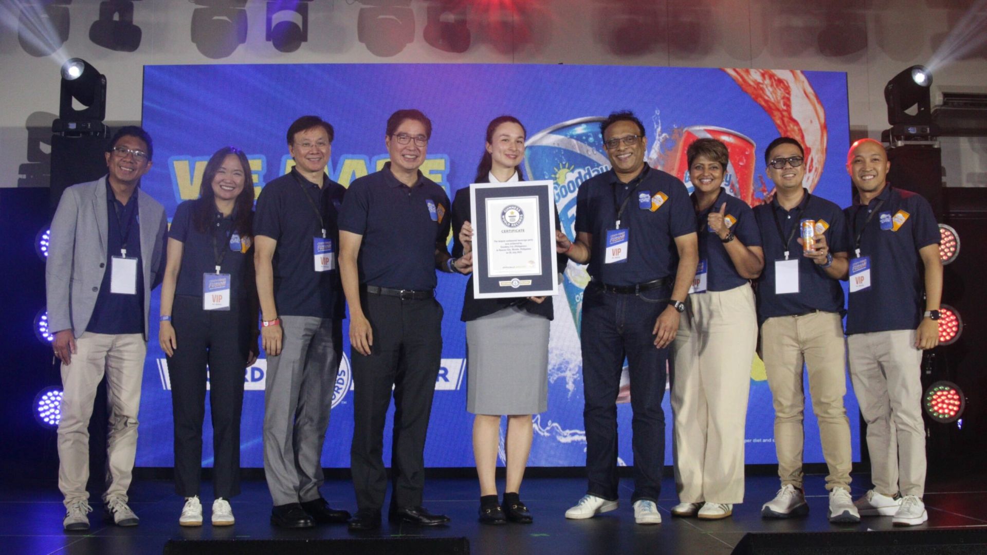 (Center) Lance Gokongwei, President and CEO of JG Summit Holdings, Inc., and Asahi South, Central and Southeast Asia Group CEO Erwin Selvarajah hold the Guinness World Record certificate for Goodday Friz, which broke the record for the largest carbonated beverage party with 766 participants.