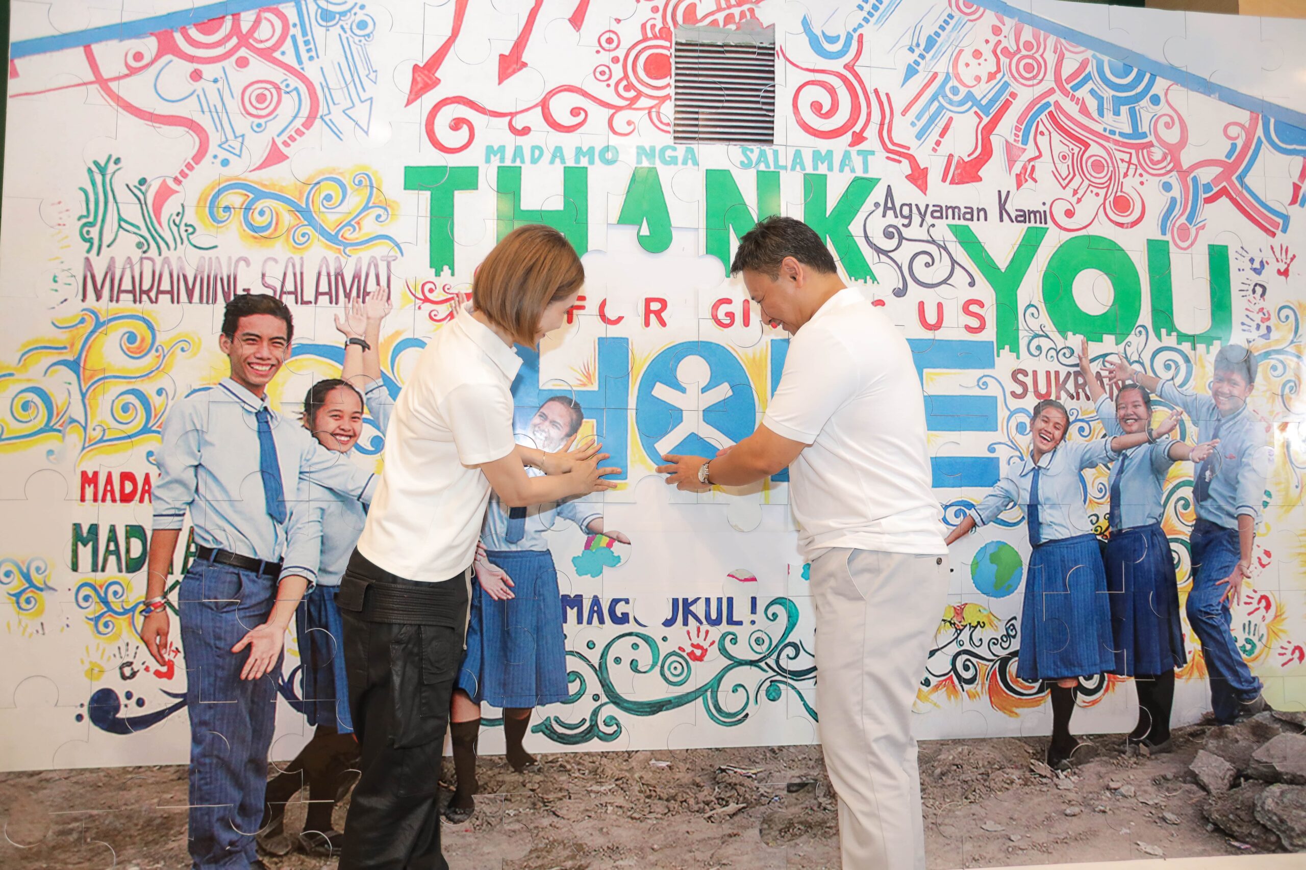 HOPE Founder Ms. Nanette Medved-Po and DepEd Secretary Sonny Angara place a puzzle piece on the HOPE Wall—a symbolic gesture of partnership and shared commitment to building a brighter future for public school students across the Philippines.