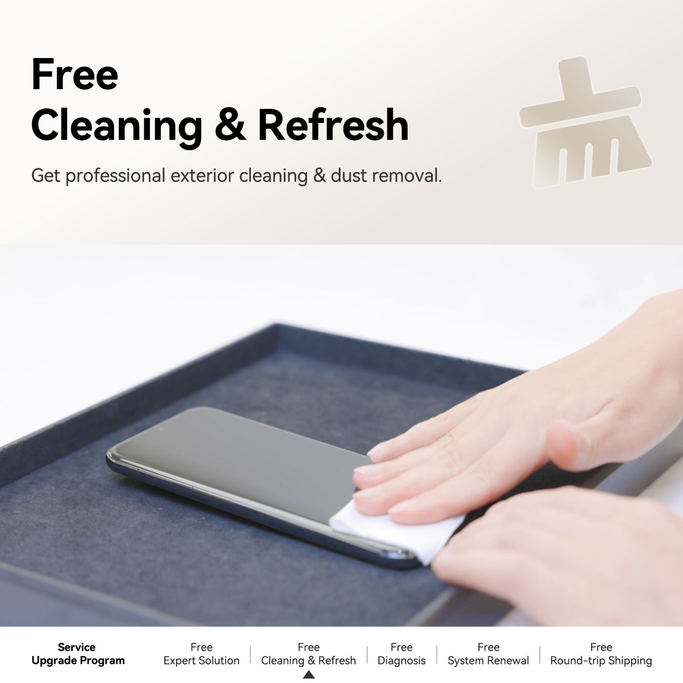 Free cleaning and refresh service cleans the device’s exterior, getting rid of hidden dust and dirt for smartphones, tablets, compact wearables, and laptops.