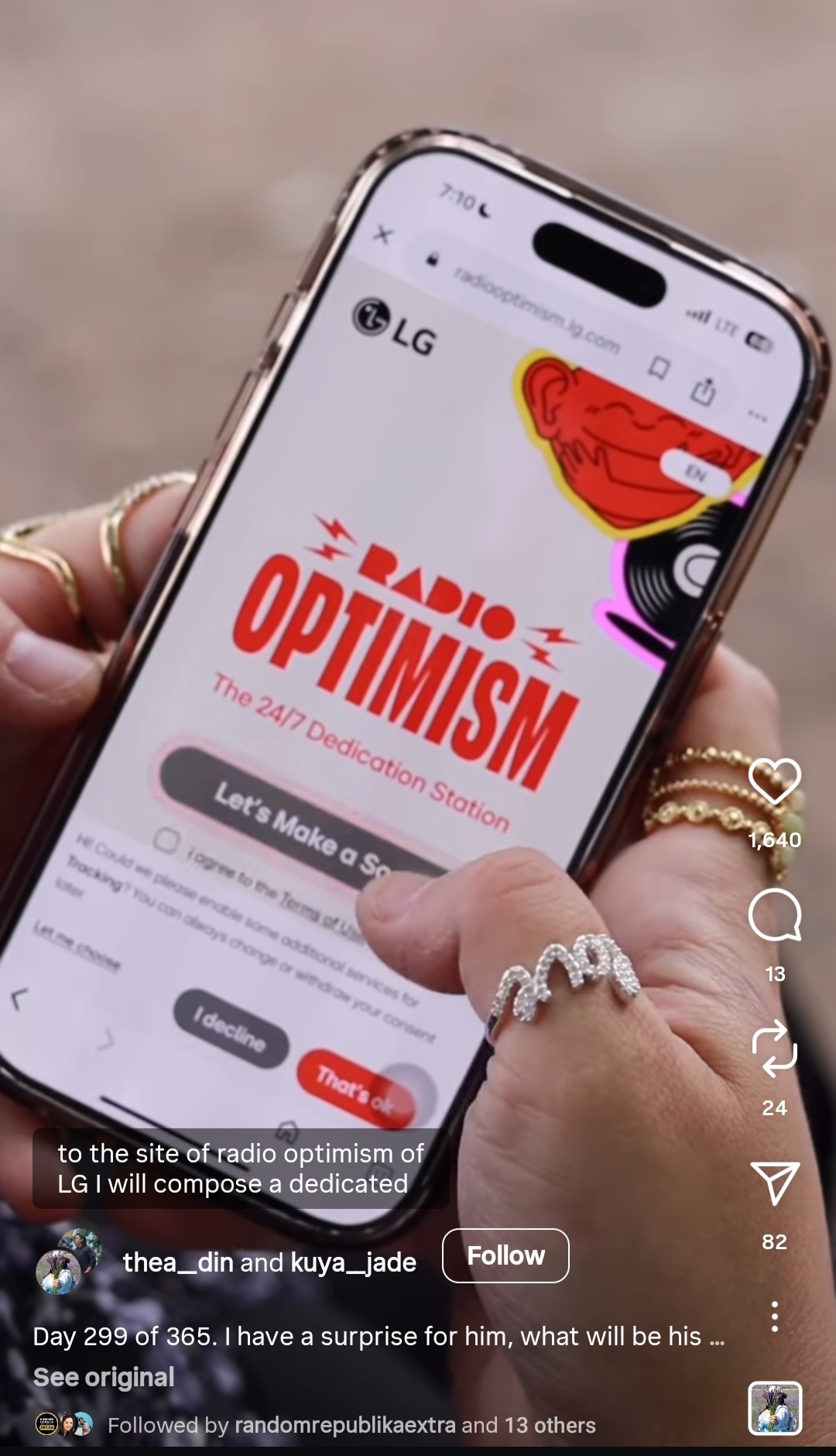 Anchored on the strong familial ties of global Filipinos to their loved ones back home, Radio Optimism was designed to counter the sense of disconnection often associated with social media. It invited users to write a message to a loved one, select a genre and vibe, and generate a one-of-a-kind AI song. By turning music into a heartfelt gesture, the campaign brought LG’s Life’s Good brand promise into the digital spaces where people most often connect.