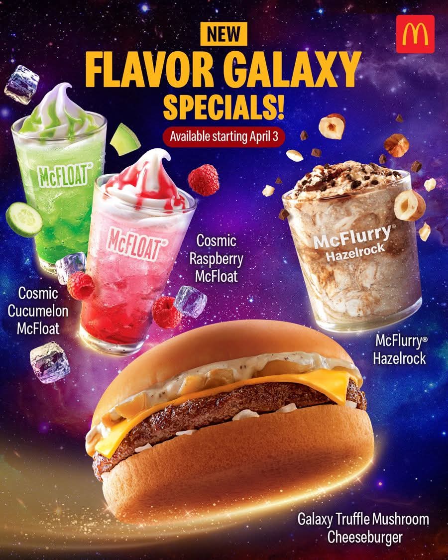 To complete the experience, McDonald’s is also introducing the Flavor Galaxy Specials—a limited-time menu designed to match the cosmic theme. The lineup includes the indulgent Galaxy Truffle Mushroom Cheeseburger, refreshing Cosmic Raspberry McFloat, Cosmic Cucumber Melon McFloat, and the rich Hazelrock McFlurry. These exclusive treats are available nationwide alongside the Happy Meal promotion.
